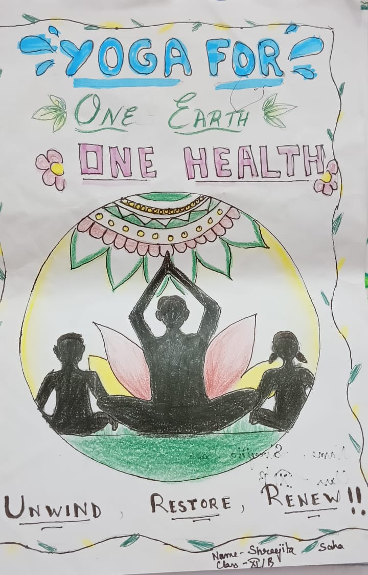 ONE EARTH, ONE HEALTH ACTIVITIES COVERED: Meditation & yogasanas for students of all classes & teachers Drawing & Painting Quiz Poster & Slogan Yogathon Friendly matches of Football (Boys) & Volleyball(Girls).
